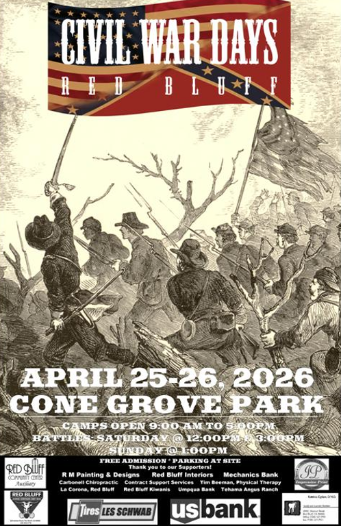 Our annual Red Bluff Civil War Days takes place at the Cone Grove Park in Red Bluff, CA, beginning Friday April 23rd with local schoolchildren invited to our school day. On Saturday and Sunday, take part in our open Union and Confederate camps, witnessing daily life of soldiers before heading over to civilian town and enjoying the hospitality of our reenactors there. Battles take place Saturday and Sunday.